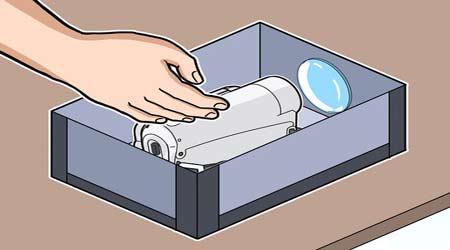 مرحله چهارم: حالا ویدئو پروژکتور شما آماده شده است. سپس ویدیوی مد نظر خود را در داخل گوشی پخش کنید. بعد از آن  موبایل را برعکس کنید ( چراکه ذره بین تصاویر را معکوس خواهد کرد) و با چند کش گوشی خود را درون جعبه محکم کنید. حالا اتاق را تاریک کرده  و محل جعبه کفش را تنظیم کنید تا ویدیو با اندازه و تصویر مد نظر شما به نمایش در بیاید.