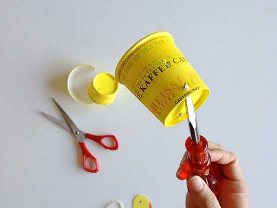 لیوان اول را بردارید، دو سوراخ در دو لبه ی بالای و یک سوراخ هم به فاصله ۱/۳ از لبه در دو طرف آن ایجاد کنید.
