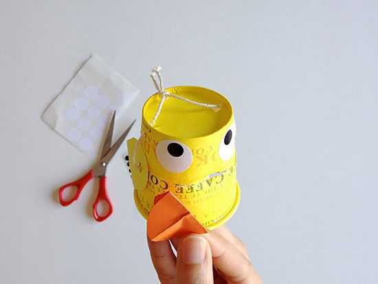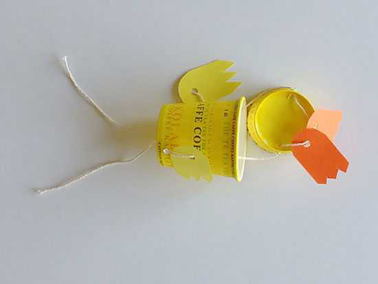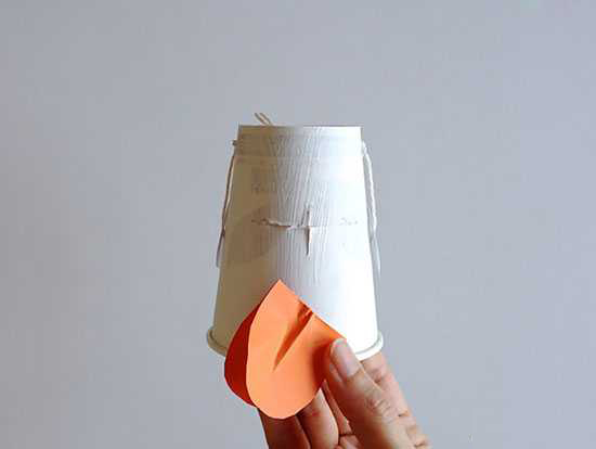 با یک کاموا بالها را به دو طرف لیوان اول و پاها را به پایین لیوان دوم وصل کنید.