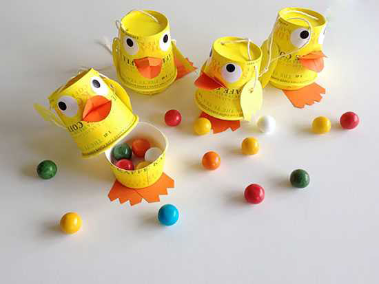 ابتدا سراغ مادر اردک ها می رویم، دو لیوان هم اندازه متوسط را بردارید یکی را کامل سفید رنگ کنید و فقط ۳/۴ دیگری را رنگ کنید. همین کار را با رنگ زرد و لیوانهای کوچک برای جوجه اردک ها هم انجام دهید و بگذارید خشک شوند.