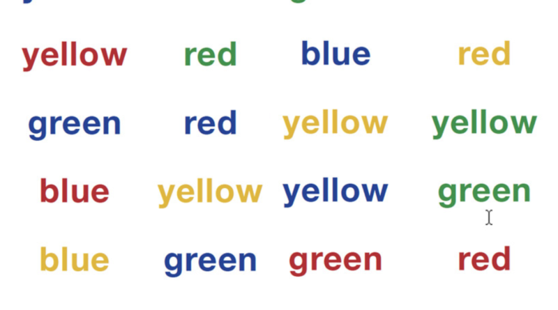 می توانید این فعالیت را یک مرتبه ی دیگر انجام دهید اما این بار دو دسته کارت یکی با اسم رنگ هایی مطابق با رنگ جوهر و دیگری با اسم رنگ هایی که همگی با جوهر سیاه نوشته شده اند را بررسی کنید. آیا می توانید تفاوتی در میزان راحتی افراد در خواندن اسم رنگ ها بر اساس اینکه جوهر نوشته همرنگ اسم رنگ باشد یا نه حس کنید؟