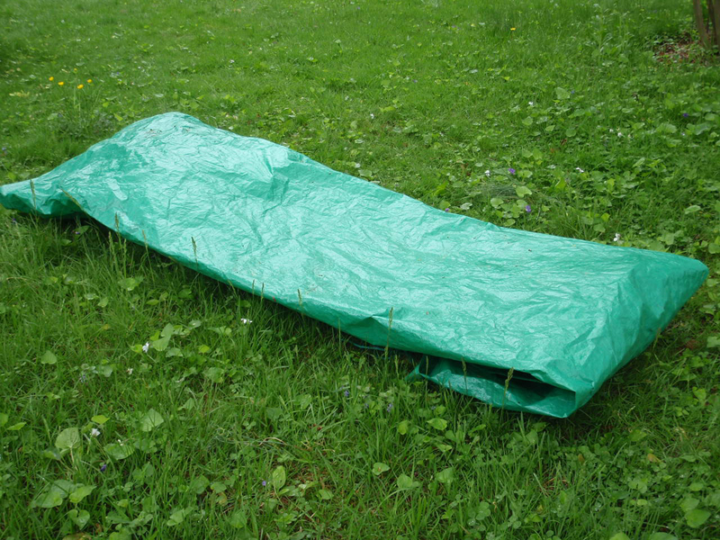اگر هنوز فرصت دارید و هیچ درخت و شاخه ای برای نصب پناهگاه ندارید و باریدن باران هم نزدیک است، با زیرانداز عایق خود کیسه خواب درست کنید. ساخت چنین محافظی در طبیعت شاید حدود ۳۰ ثانیه طول بکشد اما ایراداتی هم دارد. زیرانداز و پارچه عایق رطوبت را روی زمین پهن کنید. روی آن به قطر دراز کشیده و ابتدا گوشه جهت پاها و سپس گوشه های اطراف را به روی خود بکشید. گوشه ای که سمت سر قرار می گیرد نه تنها برای تنفس لازم است بلکه هوای درون کیسه خواب را جابه جا می کند. یادتان باشد باید زیراندازی بزرگ داشته باشید تا تماما به دور بدن شما پیچیده شود. این روش هر چند که خود باعث ایجاد رطوبت روی لباس هایتان می شود اما طبعا از محیط بارانی و خیس بیرون خشک تر خواهد بود.