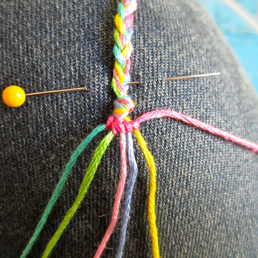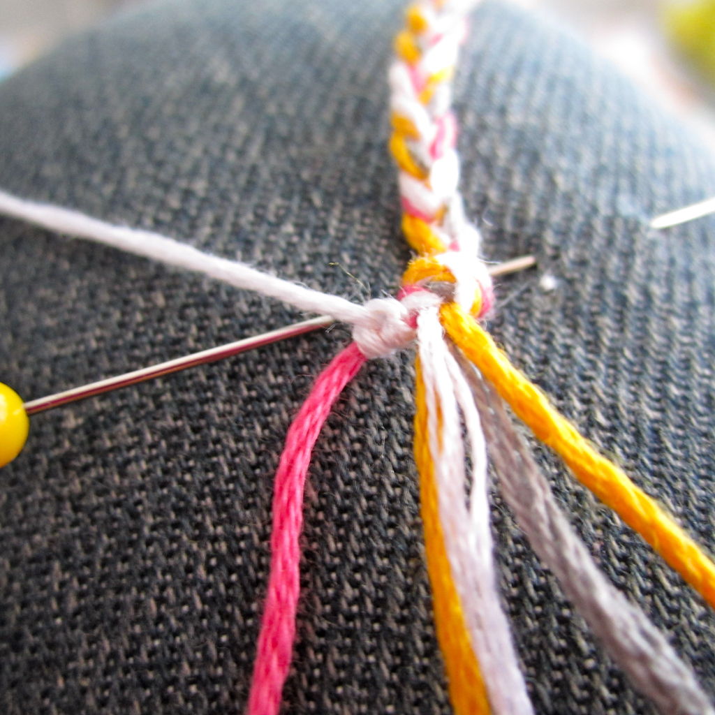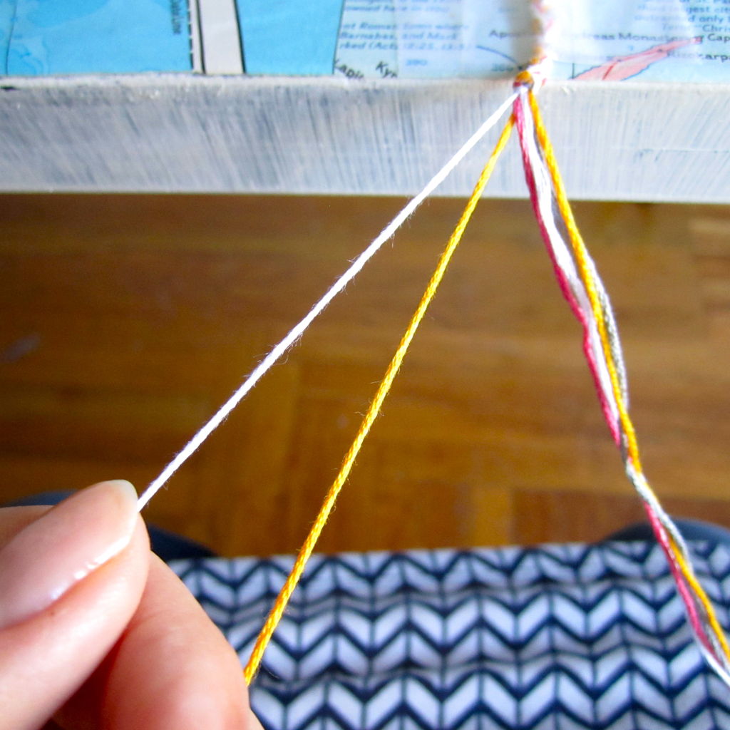 حال باید شروع کرد. نخ ها را جدا کنید و نخ را با هم قرار داده و انتهای آنها را گره بزنید. خب حالا همین انتها را به جایی مثل میز یا یک سنجاق وصل کرده و شروع به بافتن معمولی کنید. اگر ۶ رشته دارید، سه تا دو رشته ای جدا کرده و ساده ببافید. این برای قسمتی است که دستبند بسته می شود. به اندازه ای باشد که گره زدنش راحت باشد.