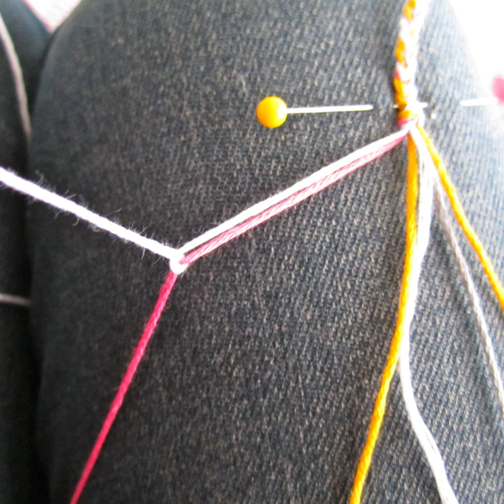 خوبی این رنگ های متفاوت این است که وقتی یک رشته بافتش تمام شد در سمت دیگر آویزان می شود و کاملا مشخص می شود و با رنگهای دیگر اشتباه نمیگیرید. اگر هم احیانا نخ را گم کردید یا گرهی را نصفه بستید می توانید با کمک یک سنجاق دوباره باز کنید و از اول ببندید.