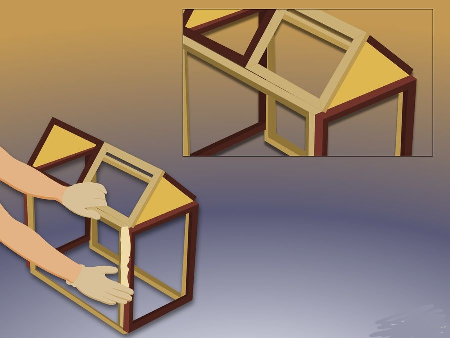 ۳- در این مرحله باید سقف گلخانه را با وصل کردن چهار قاب کوچکتر درست کنید. آن ها را به صورت دوتایی به هم وصل کنید و بعد با آن ها یک مثلث برای سقف تشکیل دهید. آن ها را با لولا به هم وصل کنید تا زمانی که می خواهید به گیاهان آب دهید بتوانید آن را باز کنید. دو قاب با اندازه ۲۰ × ۲۵ را به گونه ای در کنار هم قرار دهید که دو ضلع کوچکتر در کنار هم قرار بگیرند سپس آن ها را به هم وصل کنید. این کار را برای دو قاب دیگر هم انجام دهید. قاب های به هم وصل شده را با یک زاویه ۹۰ درجه در امتداد لبه بلندتر در کنار هم قرار دهید.