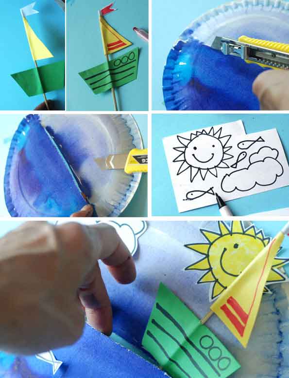 رسیدیم به مرحلهی نهایی کاردستی قایق، اونهم انداختن قایف در آب دریا هست!. با کاردک (این مرحله حتما یک بزرگتر انجام دهد) خط مرز دریا و آسمان را تا لبهی بشقاب برش بزنید و سیخ چوبی را از شکاف رد کنید.