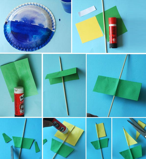 برای درست کردن قایق، روی کاغذ رنگی دو شکل مربع و مستطیل برش بزنید وسیخ چوبی را از وسط خط تای شکل مستطیل( طولی) رد کنید و با چسب دور سیخ محکم کنید. دو خط مورب از گوشه مستطیل قیچی کنید تا شکل ذوزنقه برای بدنه قایق درست شود. برای بادبان کاغذ رنگی مستطیل را برداشته و سیخ چوبی روی خط تای کاغذ چسب بزنید، اطراف کاغذ را بر روی هم قرار دهید و شکل یک مثلث برش بزنید تا بادبان کاردستی قایق درست شود.